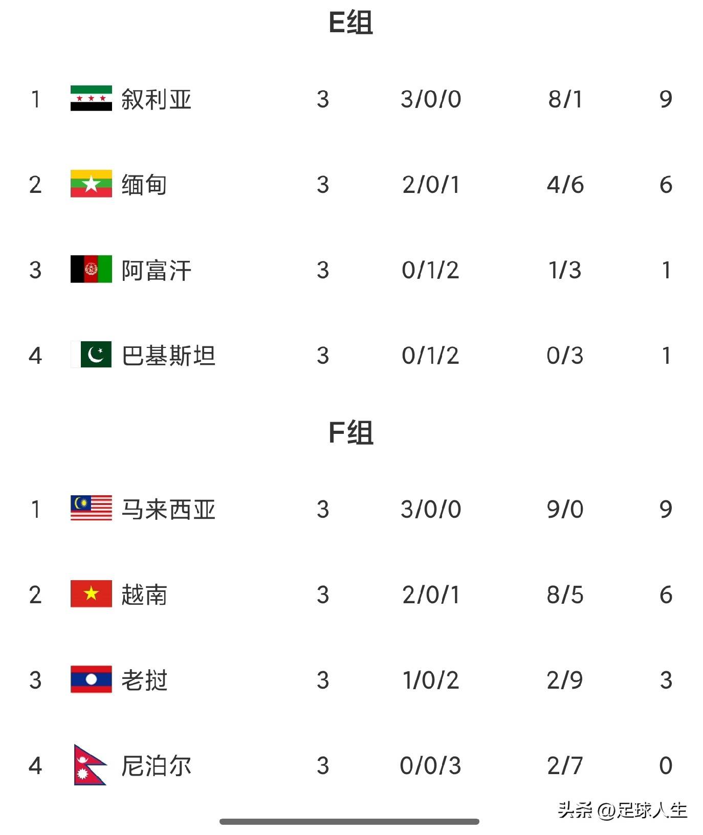其他小组中,黎巴嫩3战7分第一,马来西亚和叙利亚全胜9分第一!